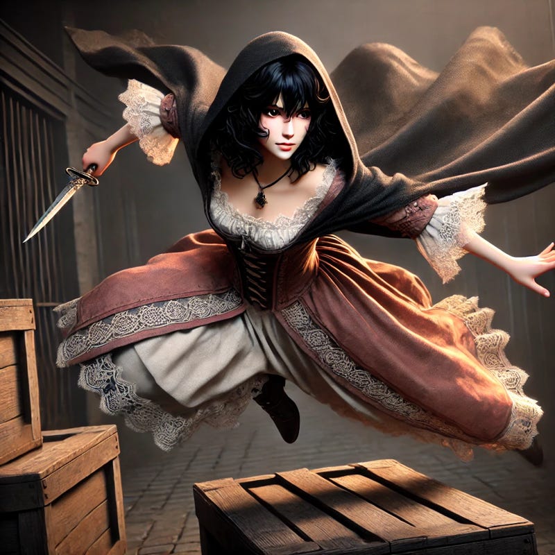 The leader regained his senses quickly and swung at her, but her reflexes were too quick. She dodged, then sidestepped behind the man she was choking with her garrote necklace. She swept her foot under his ankles, causing him to fall into the boss's feet, nearly knocking him down. The leader managed to stay upright and drew his sword, but he was too late. Marguerite sank her dagger between his ribs. His eyes widened with shock as he tried to raise his sword to strike her, but she pulled out her dagger, and the life left his eyes as he fell dead.